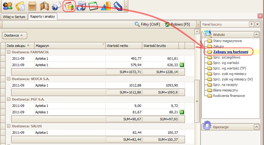 Wartość zakupów w poszczegolnych hurtowniach można sprawdzić na raporcie Zakupy wg hurtowni znajdującym się w module Raporty i analizy.