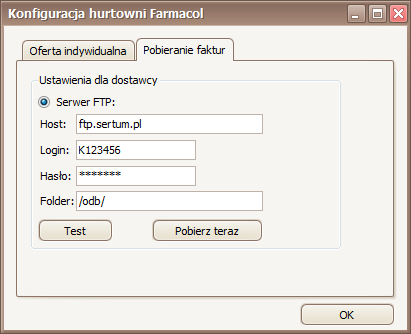 Przechodząc na zakładkę „Pobieranie faktur” można wprowadzić właściwe dane serwera FTP (otrzymamy je od działu informatyki hurtowni). Po wypełnieniu wszystkich pól możemy kliknąć przycisk: