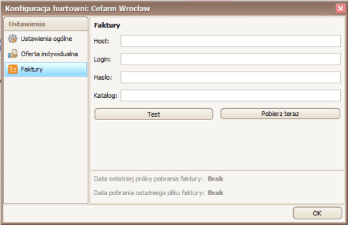 pobiera ofertę hurtowni ze wskazanego serwera. Po jego wciśnięciu pojawi się okno z komunikatami informującymi o postępie pobierania oraz o sukcesie lub porażce operacji i ewentualnych problemach.