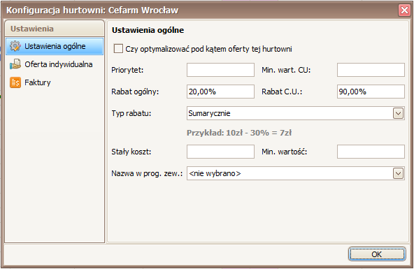 Jedną z nich jest funkcja Typ rabatu. Możemy tu określić w jaki sposób będzie przeliczany rabat dla wybranej hurtowni. Do wyboru są dwie opcje: