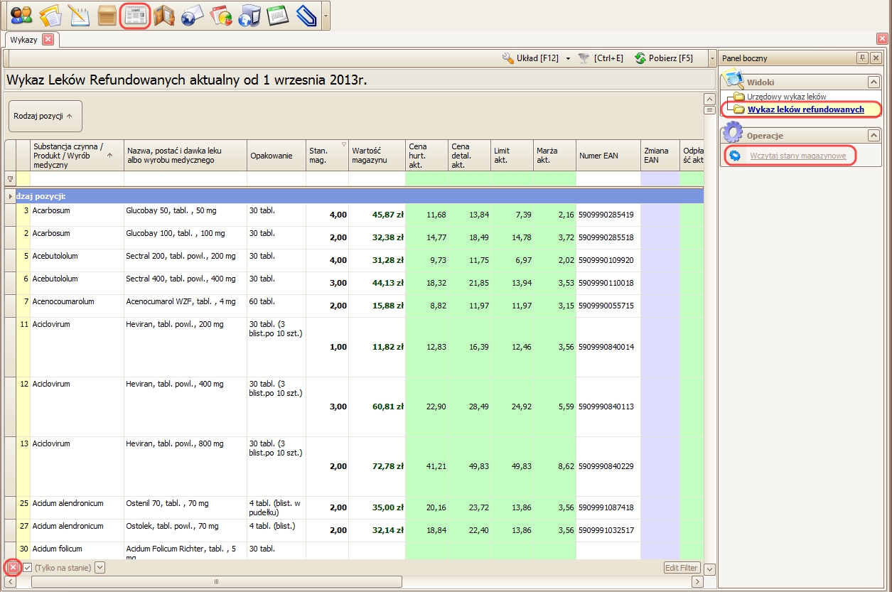 NOWOŚĆ – użycie tej operacji spowoduje wprowadzanie filtra i wyświetlenie w tabeli wyłącznie pozycji, które znajdują się na stanie w magazynie apteki.