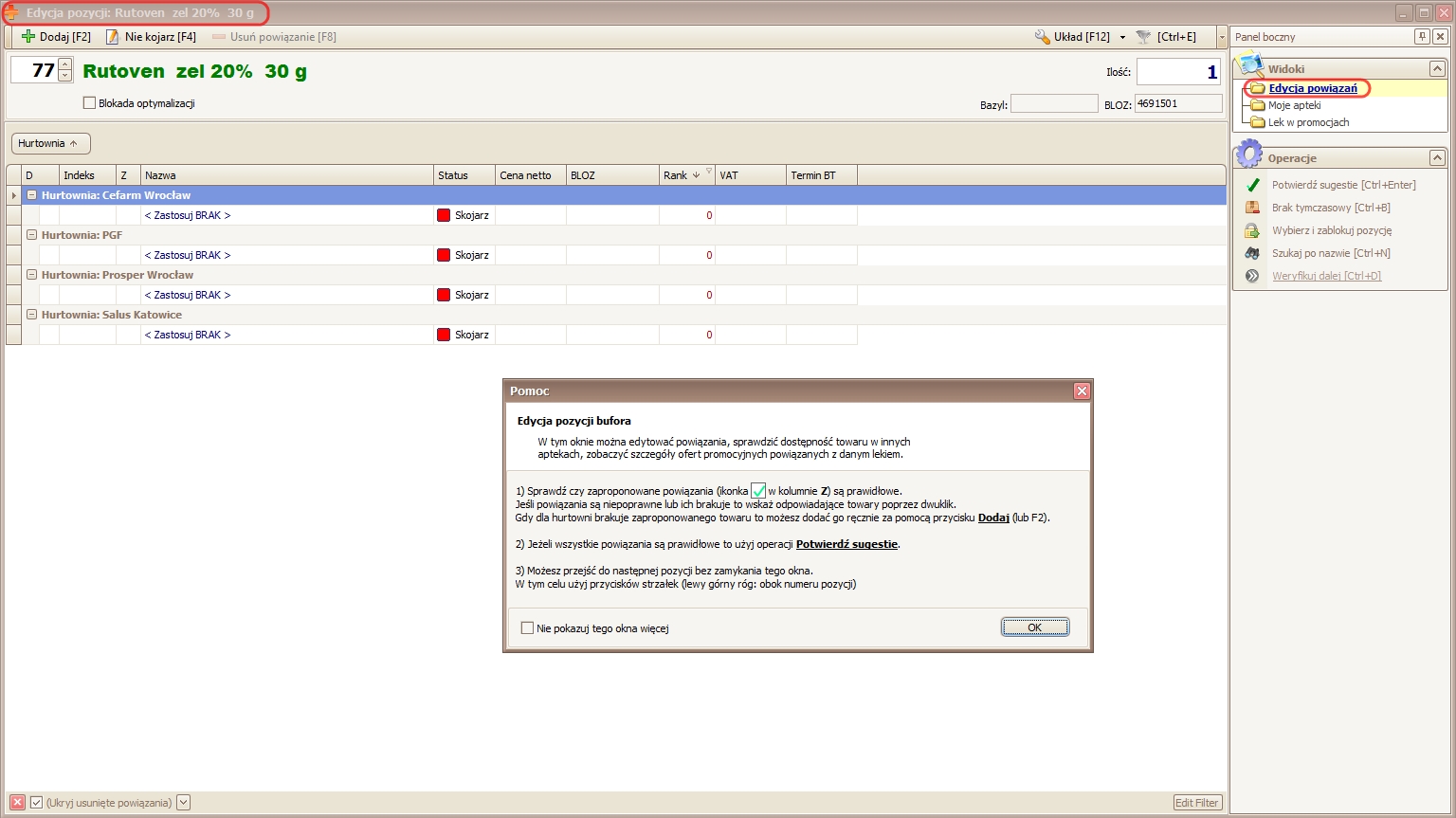 Program zasugeruje propozycje powiązań tego towaru z towarami w innych hurtowniach biorąc pod uwagę kod BLOZ towaru, który wskazano do powiązania w pierwszej hurtowni. Stanowi to spore ułatwienie, gdyż do tej pory należało samodzielnie powiązać towar z każdą z hurtowni. Sugestie powiązań należy potwierdzić klikając dwukrotnie na ikonie