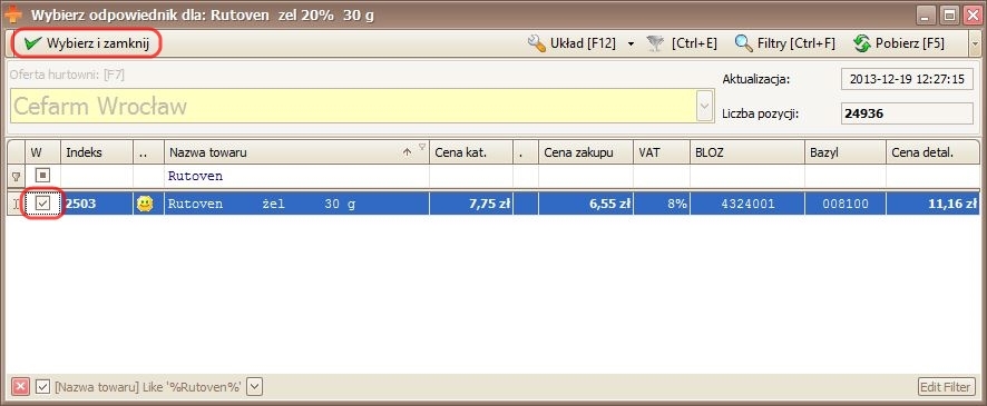 Chcąc powiązać towar z pierwszą hurtownią znajdującą się na liście – należy zaznaczyć ją, a następnie kliknąć przycisk