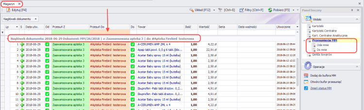 Jak widać, na powyższym obrazie, dla aptek widok Przesunięcia MM wyświetla się również w podziale na dwa podwidoki: Ode mnie i Do mnie. Menedżer sieci aptek będzie widział tylko widok Przesunięcia MM bez rozbicia na powidoki.