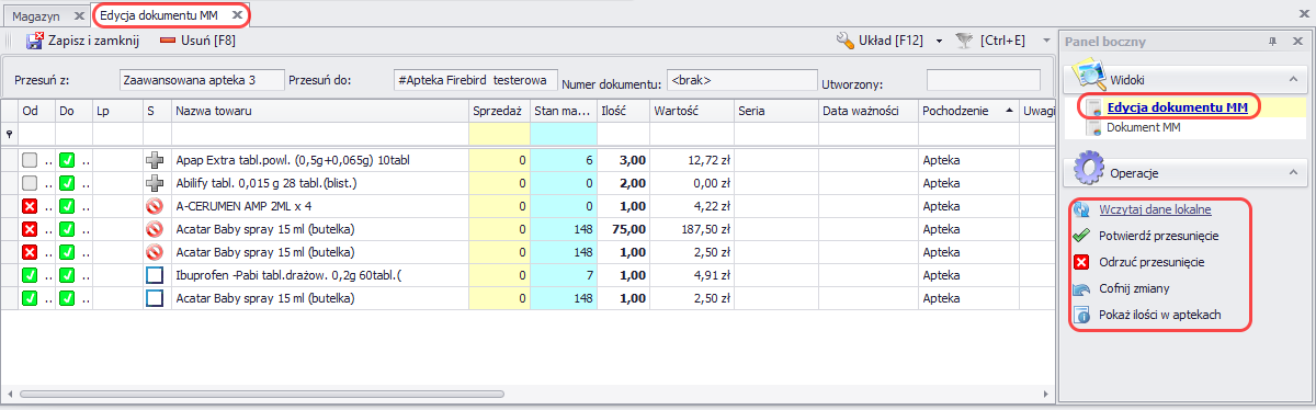 Jak widać, na powyższym obrazie, dla aptek widok Przesunięcia MM wyświetla się również w podziale na dwa podwidoki: Ode mnie i Do mnie. Menedżer sieci aptek będzie widział tylko widok Przesunięcia MM bez rozbicia na powidoki.