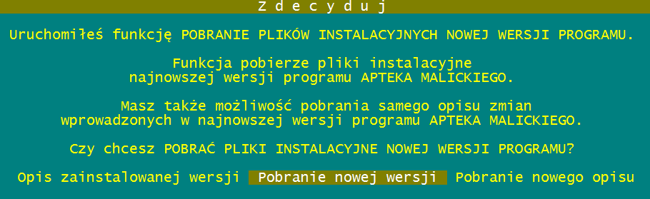 Aby pobrać aktualną wersję programu APTEKA MALICKIEGO, na jedynym działającym stanowisku uruchom FUNKCJE -> NOWA WERSJA -> POBRANIE NOWEJ WERSJI.