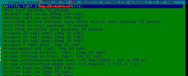 Aby sprawdzić datę wersji posiadanego przez Ciebie Wykazu Leków DATUM, uruchom SŁOWNIKI -> ASORTYMENT APTEKI -> MODYFIKACJE -> POPRAWIANIE. Zjedź kursorem na dół do pola ODPOWIEDNIK W WYKAZIE DATUM i wpisz tam 0 (ZERO). Po wciśnięciu klawisza ENTER otworzy się okienko o tytule „Słownik Datum” wraz z datą produkcji Wykazu Leków DATUM.