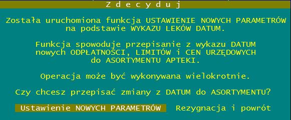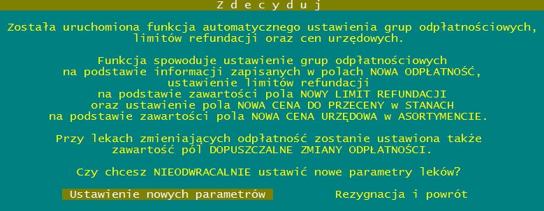 Możesz przejrzeć efekt USTAWIENIA PARAMETRÓW porównując kolumny NOWA ODPŁATNOŚĆ z aktualnymi odpłatnościami, NOWY LIMIT z aktualnym limitem oraz NOWA CENA z kolumną CENA URZĘDOWA. W przypadku znalezienia błędu należy poprawić powiązanie z FBD BAZYL i ponownie wykonać funkcję ASORTYMENT -> DATUM -> USTAWIENIE PARAMETRÓW.