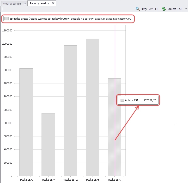 Najechanie kursorem myszy na wybrany słupek powoduje wyświetlenie pionowej linii, która wskazuje, która apteka jest aktualnie zaznaczona oraz dymku z informacją o wartości sprzedaży w tej aptece (w zł). W górnym prawym rogu wykresu znajduje się legenda.