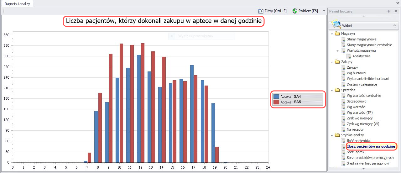 2. Ilość pacjentów na godzinę – umożliwia szczegółową analizę dokonanych zakupów przez pacjentów w konkretnym przedziale czasu;