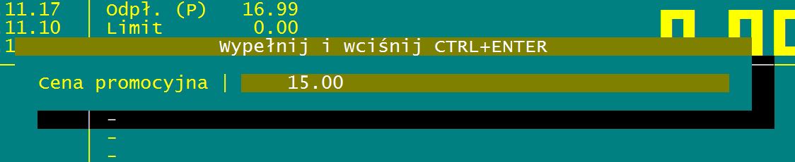 Podczas ekspedycji leku pełnopłatnego, wykonywanej przez uprawnionego operatora, po wprowadzeniu znaku = (równa się) w polu Zmiana odpł, jako proponowana detaliczna cena promocyjna, pojawia się obecnie cena zapisana w polu Cena promocyjna 1 w karcie leku w Asortymencie.