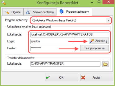 Pola Lokalizacja, Login i Hasło uzupełnią się automatycznie. W celu sprawdzenia poprawności konfiguracji kliknij przycisk „Test połączenia”. Jeżeli konfiguracja jest prawidłowa otrzymasz komunikat „Połączenie z bazą danych zakończone sukcesem”.Zamknij okno konfiguracji klikając przycisk
