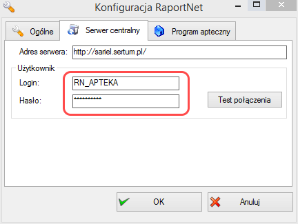 - W oknie konfiguracyjnym przejdź do zakładki Serwer centralny i wpisz Login i Hasło, które od nas otrzymałeś.