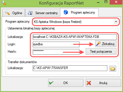 Pola Lokalizacja, Login i Hasło uzupełnią się automatycznie. W celu sprawdzenia poprawności konfiguracji kliknij przycisk „Test połączenia”. Jeżeli konfiguracja jest prawidłowa otrzymasz komunikat „Połączenie z bazą danych zakończone sukcesem”.Zamknij okno konfiguracji klikając przycisk