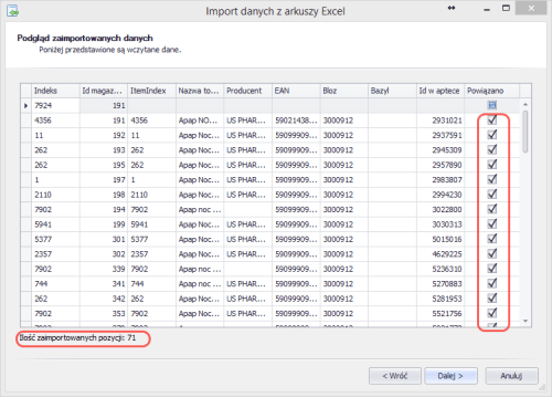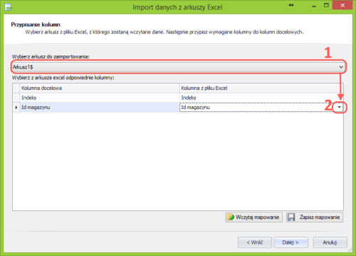 Po wskazaniu kolumn w Excelu, zawierających Indeks oraz Id magazynu, ponownie klikamy przycisk Dalej.