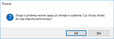 W oknie uzupełniamy pole Nazwa grupy. Nazwa powinna być unikatowa, tzn.: nie może istnieć w Sertum grupa o takiej samej nazwie. Jeżeli grupa o takiej nazwie już istnieje, to po kliknięciu przycisku OK otworzy się okno z pytaniem: