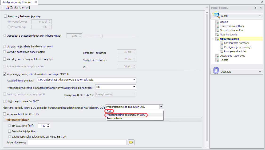 Zmiana dotyczyć będzie opcji wyboru algorytmu rozkładu leków z ceną urzędową pomiędzy hurtowniami bez zdefiniowanej wartości leków z ceną urzędową. Zostanie usunięta opcja „Brak”, która powodowała losowość w przypisywaniu zamówień leków z ceną urzędową do hurtowni. Dla aptek, które nie miały określonego sposobu rozdziału leków z ceną urzędową pomiędzy hurtownie (miały ustawioną opcję „Brak”), zostanie domyślnie wybrany algorytm rozkładu leków z ceną urzędową „Proporcjonalnie do zamówień OTC”.