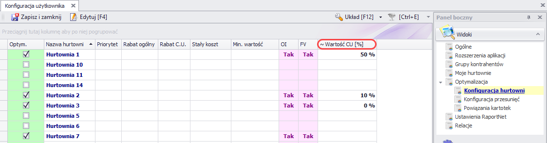 Kolumna „Min. wart. CU [%]” zostanie zastąpiona kolumną „~ Wartość CU [%]”, w której należy podać maksymalną wartość procentową leków z ceną urzędową (w stosunku do całości zamówienia leków z ceną urzędową), która ma zostać skierowana do danej hurtowni. Do hurtowni, które nie mają określonej wartości procentowej leków z ceną urzędową zostaną one przydzielone do zamówienia zgodnie z ustawionym w Optymalizacji algorytmem.