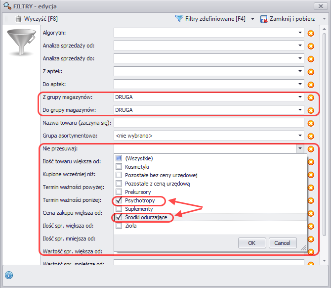h) ZiołaDomyślnie na filtrze Nie przesuwaj zaznaczone będą: Psychotropy i Środki odurzające.