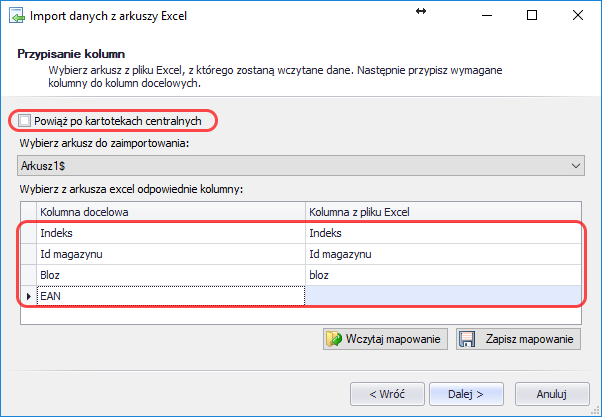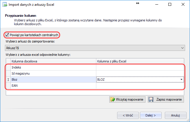 - Przy zaznaczonej opcji Powiąż po kartotekach centralnych i po wybraniu arkusza do zaimportowania należy wskazać kolumnę z pliku Excela z numerem Bloz lub EAN lub, tak jak do tej pory, z Indeksem i Id magazynu: