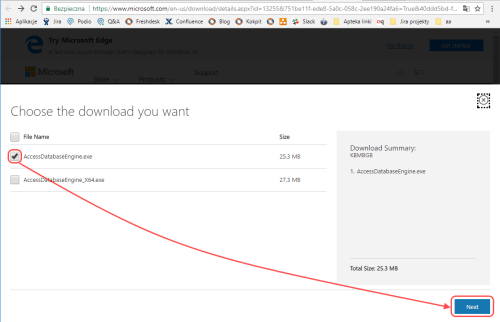 Następnie, w oknie które się otworzy należy wybrać plik „AccessDatabaseEngine.exe” oraz kliknąć przycisk „Next”: