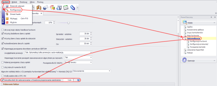 - Konfiguracja jest możliwa z poziomu apteki w System -> Konfiguracja -> Optymalizacja -> Domyślna ilość dni zatowarowania w Kreatorze proponowania zamówienia. Przy wskazanej opcji należy zaznaczyć checkbox oraz podać ilość dni, która ma zostać ustawiona w kreatorze.