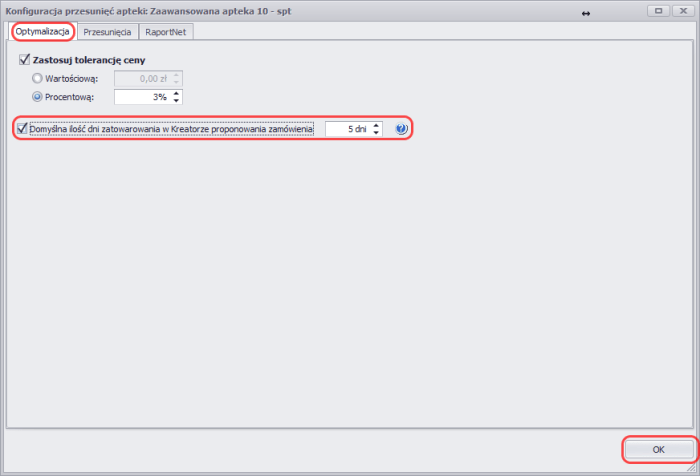 Po otwarciu się okna z ustawieniami konfiguracji apteki, w zakładce Optymalizacja, przy opcji Domyślna ilość dni zatowarowania w Kreatorze proponowania zamówienia należy zaznaczyć checkbox oraz podać ilość dni, która ma zostać ustawiona w kreatorze. Następnie należy kliknąć OK potwierdzając zapis konfiguracji.