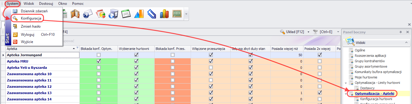 - Istnieje także możliwość określenia domyślnych ustawień ilości dni zatowarowania z poziomu menedżera dla poszczególnych aptek w sieci. Należy wejść w System -> Konfiguracja -> Optymalizacja – Apteki: