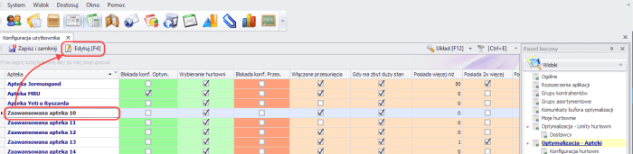 Następnie wskazać aptekę, dla której chcemy zmienić ustawienia i wybrać Edytuj [F4]: