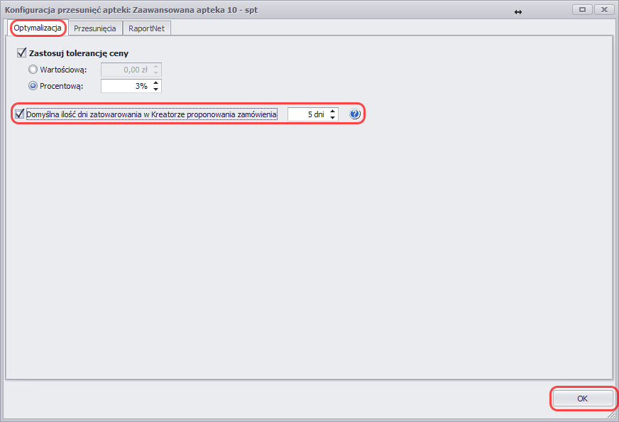 Po otwarciu się okna z ustawieniami konfiguracji apteki, w zakładce Optymalizacja, przy opcji Domyślna ilość dni zatowarowania w Kreatorze proponowania zamówienia należy zaznaczyć checkbox oraz podać ilość dni, która ma zostać ustawiona w kreatorze. Następnie należy kliknąć OK potwierdzając zapis konfiguracji.