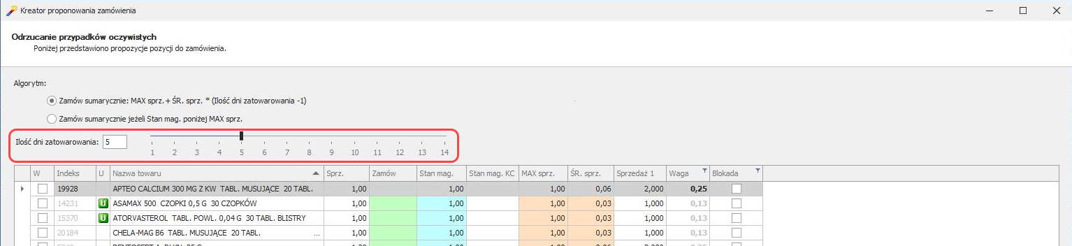 Obecnie w Sertum można skonfigurować domyślne ustawienie ilości dni zatowarowania w Kreatorze proponowania zamówienia. Jeżeli nie zmienimy ustawień w konfiguracji, ilość dni zatowarowania w kreatorze, będzie ustawiona domyślnie na 1 dzień, tak jak do tej pory.