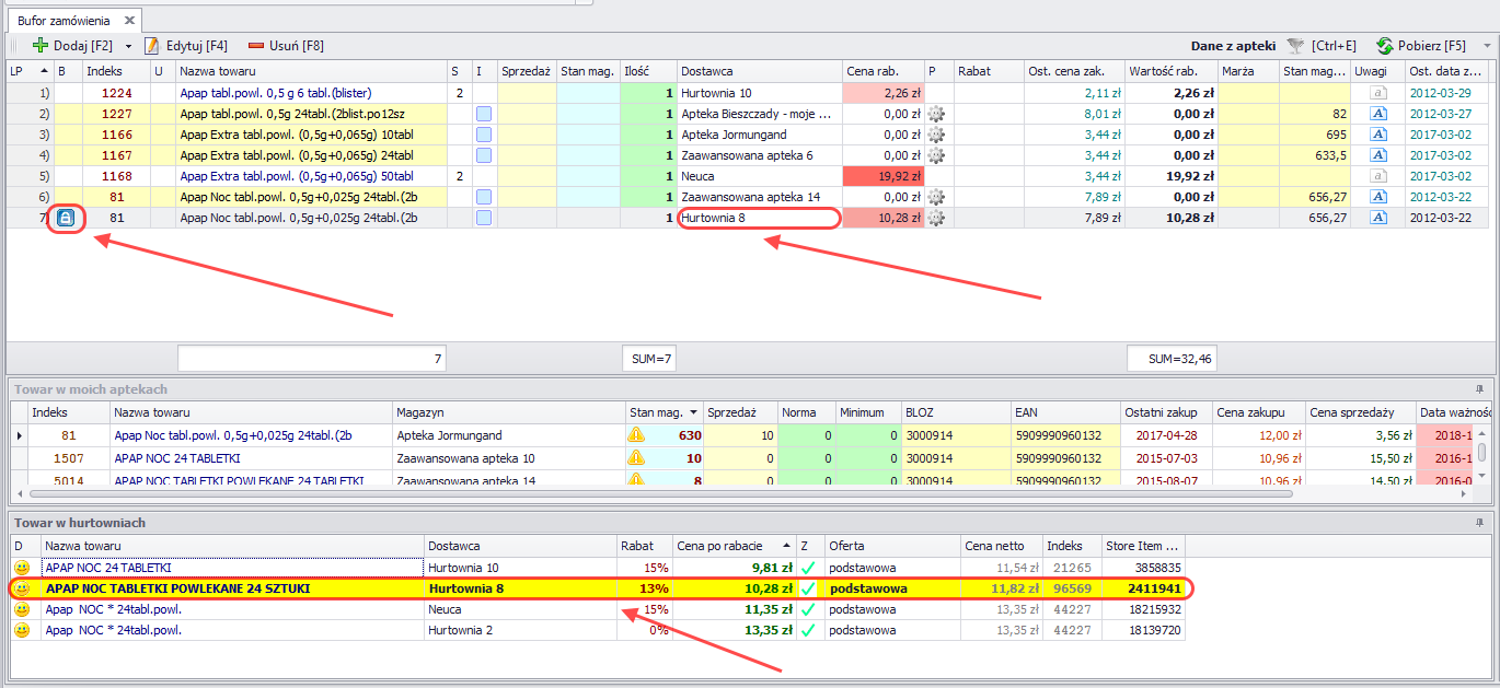 Uwaga! Dla pozycji dodanych jako duplikaty kłódki nie można ściągnąć. Po zoptymalizowaniu zamówienia, dla pozycji z kłódką należy ręcznie wskazać Dostawcę (hurtownię lub aptekę w sieci). Jeżeli dostawca nie zostanie wskazany pozycja nie zostanie wysłana.