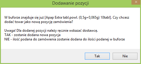 Po wybraniu z magazynu apteki pozycji, która aktualnie znajduje się już w buforze zamówienia pojawi się okno z pytaniem: