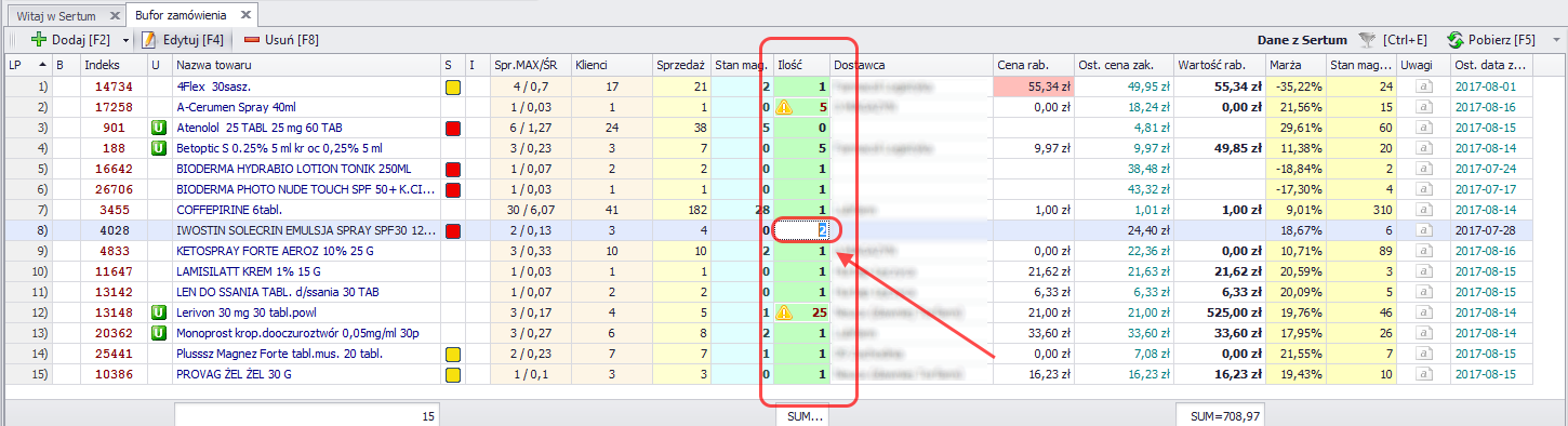Aby zmienić ilość na wytypowanych do zamówienia przez Sertum pozycjach należy ustawić kursor myszy w kolumnie Ilość-wartość umieszczona w komórce podświetli się na niebiesko. Za pomocą klawiatury ustawiamy konkretną ilość do zamówienia. Dalej poruszać po buforze możemy się za pomocą strzałki w dół (przycisk na klawiaturze), wtedy program przejdzie do pola zawierającego komórkę z ilością następnej pozycji z zamówienia.