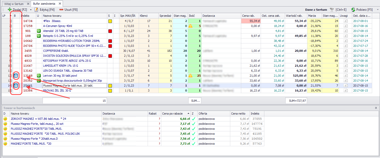 Kłódkę możemy założyć zarówno na hurtowni jak i na aptece. Aby ją założyć klikamy dwukrotne lewym przyciskiem myszy na pierwszą kolumnę w buforze – kolumna B (Blokada- nie optymalizuj tej pozycji). W ten sam sposób ściągamy blokadę z pozycji.