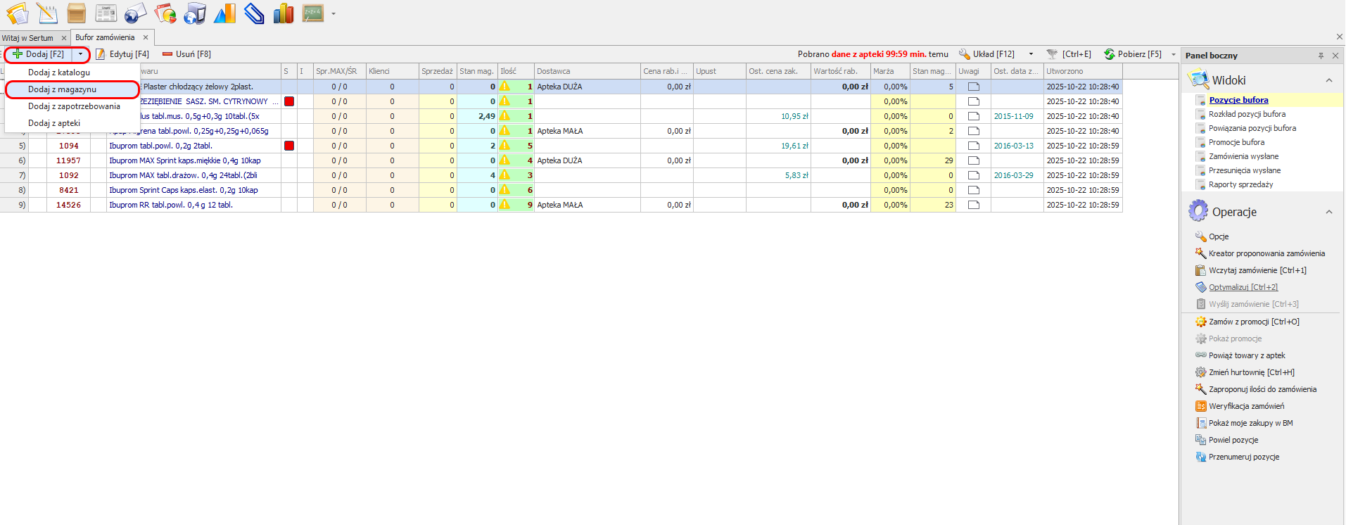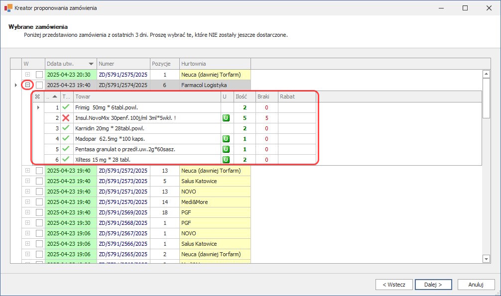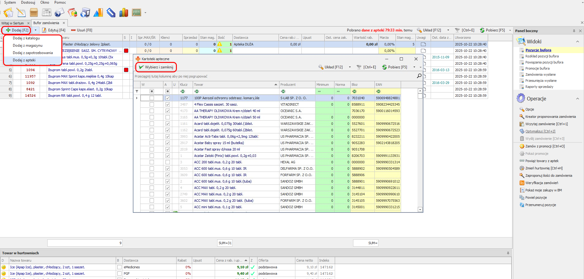 Wybrane pozycje zamówień zostaną wczytane do bufora, jak podczas wczytywania zamówienia z programu aptecznego: