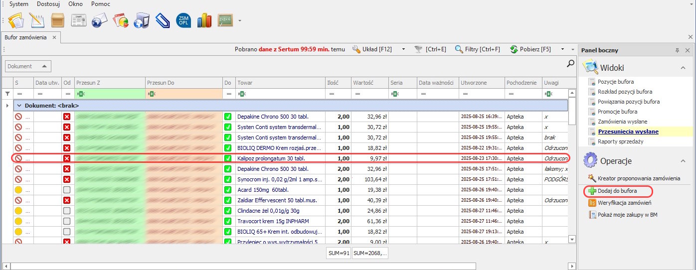 Widok posiada również operację  , która umożliwia dodanie pozycji z przesunięcia (np. takich, które zostały odrzucone) do bufora zamówienia. W tym celu należy zaznaczyć wybraną pozycję przesunięcia, a następnie kliknąć operację .