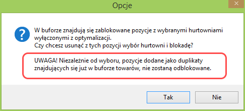 Jeżeli dla pozycji dodanej jako kolejna do bufora wskazana zostanie hurtownia, to przy wyłączeniu w Opcjach tej hurtowni pojawi się komunikat: