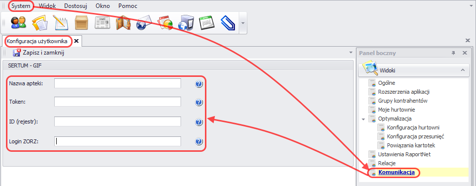 W celu uruchomienia raportowania odmów realizacji zamówień przez Sertum, apteka musi w System -> Konfiguracja -> Komunikacja podać: