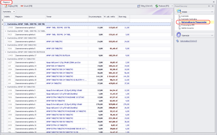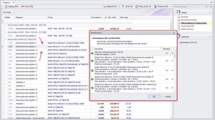 Etap 2: „Optymalizacja” – Sertum analizuje tu sprzedaż oraz aktualne stany magazynowe w aptekach i na podstawie zadanych parametrów, sugeruje przesunięcia towarów między aptekami (tak, aby każda z wybranych aptek posiadała towar, na taką samą liczbę dni sprzedaży).