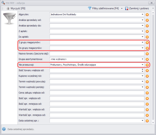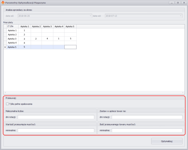 - Z aptek i Do aptek – lista aptek, pomiędzy którymi będą przesuwane towary.