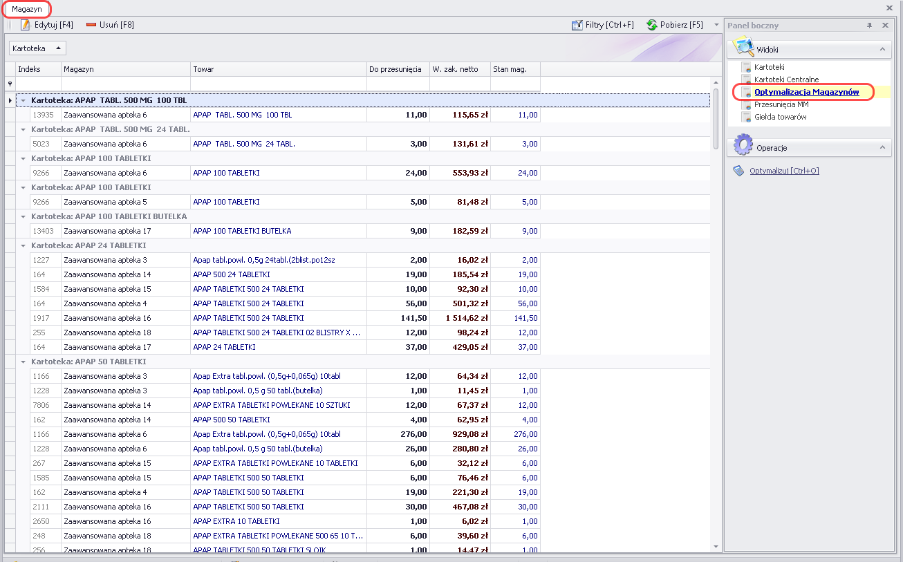 […] Centralna optymalizacja magazynów. Zarządzanie magazynem za pomocą jednego narzędzia, umożliwi w prosty i szybki sposób zoptymalizować stany magazynowe we wszystkich aptekach jednocześnie. Końcowy etap optymalizacji pozwala natomiast na wykonanie za apteki przesunięć między magazynami. Tak przygotowane przesunięcia, będą czekały w programie aptecznym jedynie na wczytanie/zatwierdzenie. […]