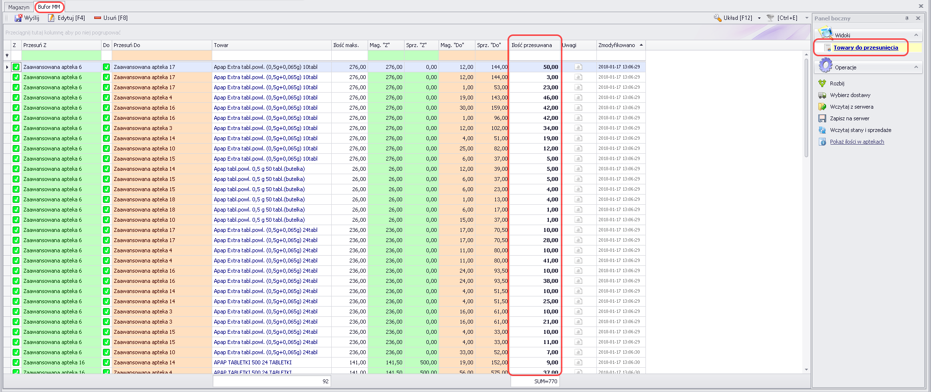 - Z aptek i Do aptek – lista aptek, pomiędzy którymi będą przesuwane towary.