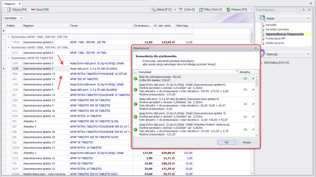 Etap 2: „Optymalizacja” – Sertum analizuje tu sprzedaż oraz aktualne stany magazynowe w aptekach i na podstawie zadanych parametrów, sugeruje przesunięcia towarów między aptekami (tak, aby każda z wybranych aptek posiadała towar, na taką samą liczbę dni sprzedaży).