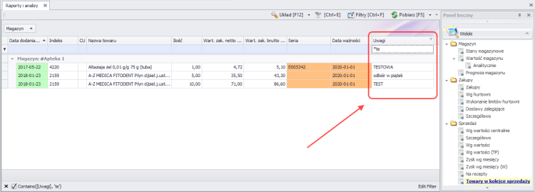 - Do raportu Towary w kolejce sprzedaży, zostało dodane pole z Uwagami uzupełnionymi w programie aptecznym;