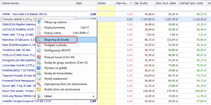 - Klikamy prawym klawiszem myszy na dane raportu w Sertum. Pojawi się menu z którego wybieramy Eksportuj do Excela: