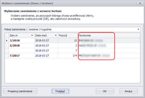 - W Buforze zamówienia (przy pracy na Danych z Sertum) po użyciu operacji Wczytaj zamówienie na liście zamówień będzie widoczna nazwa hurtowni. Nazwa ta będzie widoczna tylko dla nowych zamówień.