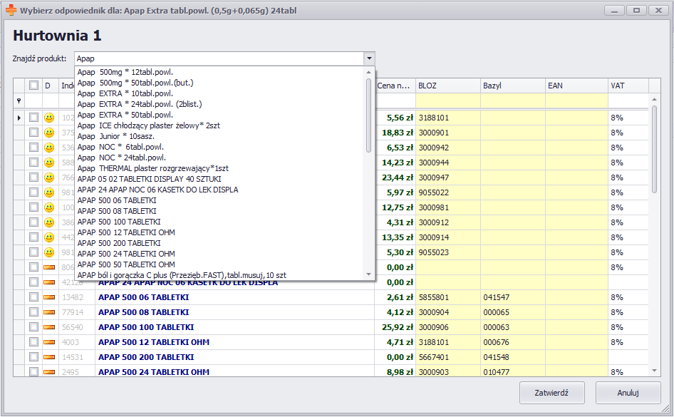 - Zostało stworzone całkowicie nowe okno, w którym wiążemy kartoteki z katalogu hurtowni do karty towaru z apteki. Nowe okno dzięki prostej obsłudze z poziomu klawiatury oraz sprawnej wyszukiwarce pozycji zapewnia płynniejszą pracę. Aktualnie pracując na oknie edycji powiązań, Sertum zużywa mniejsze zasoby pamięci RAM, dzięki czemu pracuje się szybciej, zwłaszcza przy tworzeniu wielu powiązań jednocześnie.