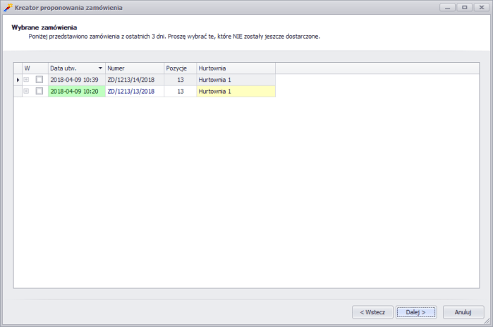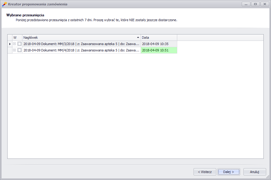 - Przywróciliśmy krok Wybrane przesunięcia, w którym wyświetlane są wszystkie przesunięcia, na które czeka apteka, z ostatnich 7 dni. W kroku tym można wskazać przesunięcia, które jeszcze nie dotarły do apteki. Zamówienie stworzone przez Kreator zostanie pomniejszone o ilości z zaznaczonych przesunięć, co nie pozwoli na nadmierne zatowarowanie apteki.