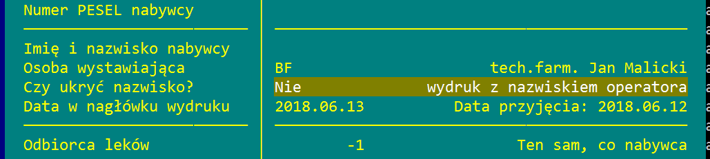W funkcji Wydruki -> Rachunek dla odbiorcy dodano parametr Czy ukryć nazwisko? Parametr steruje drukowaniem bądź niedrukowaniem nazwiska osoby wystawiającej na wydruku faktury dla pacjenta. Wartość nowego parametru jest zapamiętywana indywidualnie dla każdego odbiorcy.
